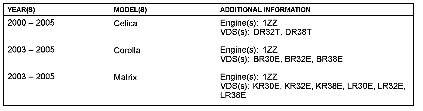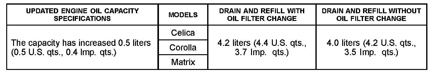 The 1ZZ-FE engine oil capacity and oil level gauge assembly (dipstick) has been updated for specific model year Celica Corolla and Matrix vehicles. Refer to the information below for the updated capacity and part number information.