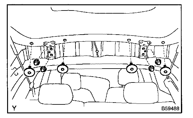 a. Remove the 2 nuts, window glass spacer No.1, back door hinge male pad and back door glass from the back door hinge assembly RH.