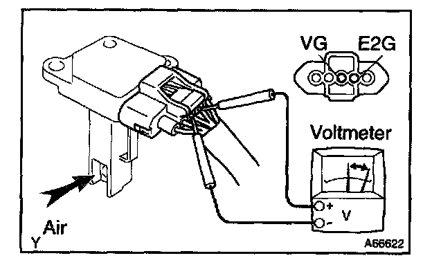 4. Blow air into the intake air flow meter, and check that the voltage fluctuates.