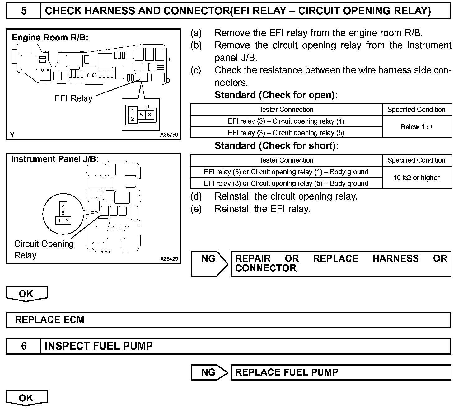 When the STA signal and NE signal are input to the ECM, Tr is turned ON, current flows to the coil of the circuit opening relay (marked: C/OPN), the relay switches on, power is supplied to the fuel pump and the fuel pump operates.