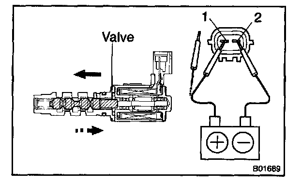 Connect the positive (+) lead from the battery to terminal 1 and negative (-) lead to terminal 2, and check the movement of the valve.