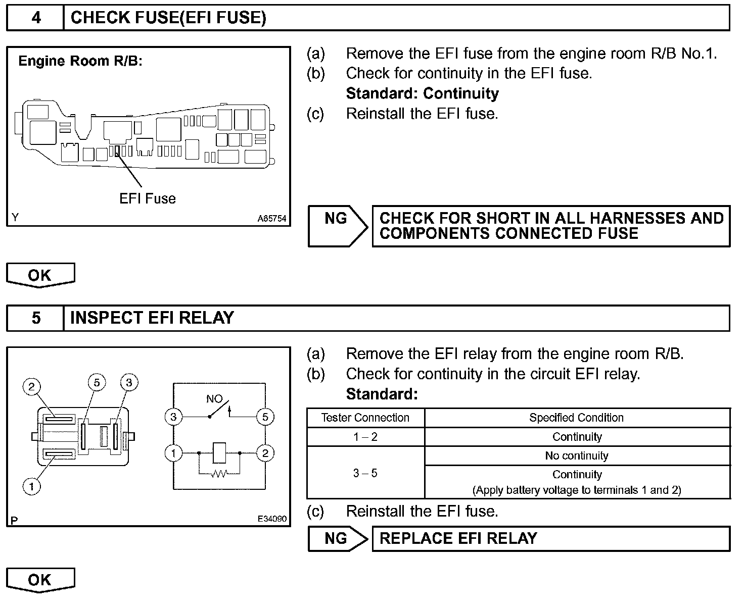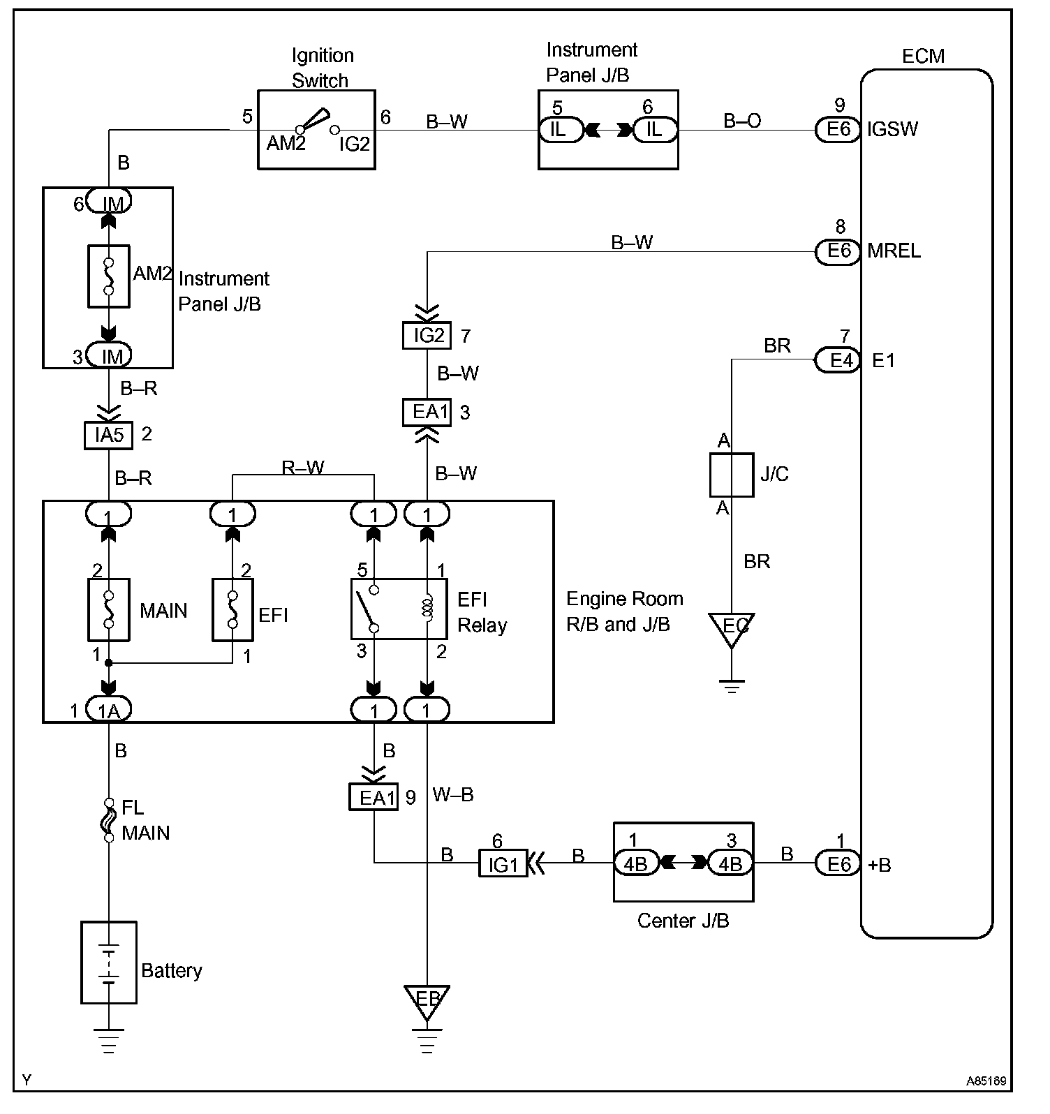 When the ignition switch is turned ON, the battery positive voltage is applied to the coil which closes the contacts of the EFI relay (Marked: EFI) and supplies power to terminal +B of the ECM.