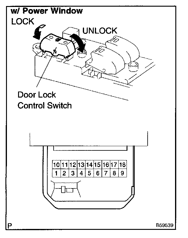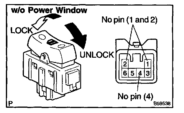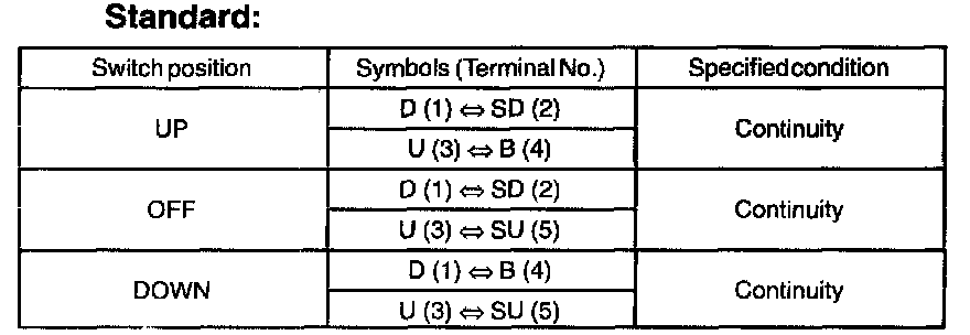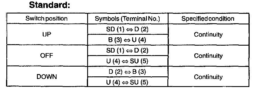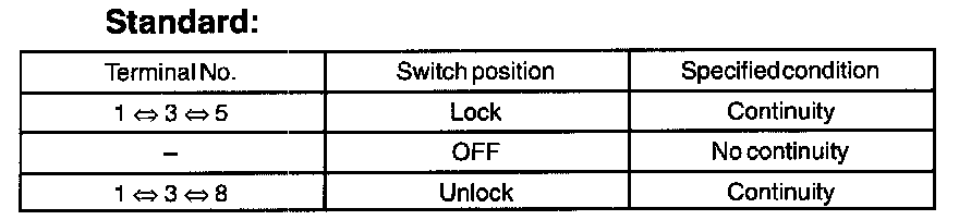 Inspect the door lock control switch continuity, as show in the illustration and table.