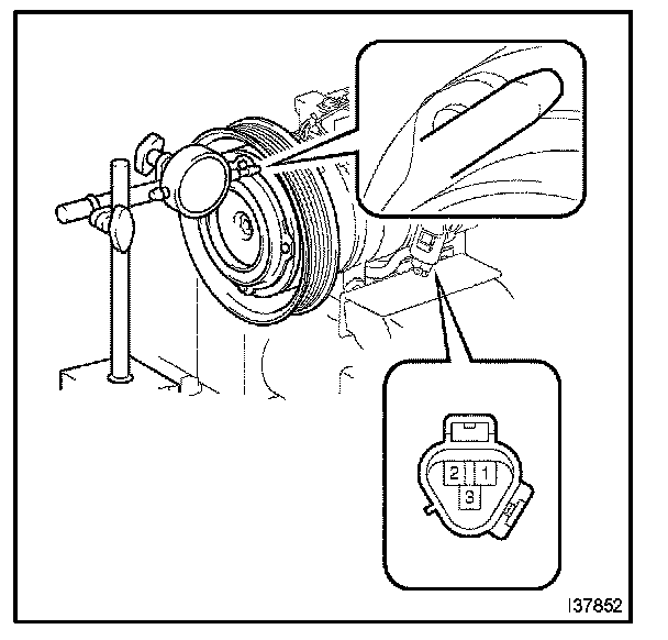 b. Connect the battery positive lead to terminal 3 of the magnet clutch connector and the negative lead to the earth wire. Turn the magnet clutch on and off and measure the clearance.