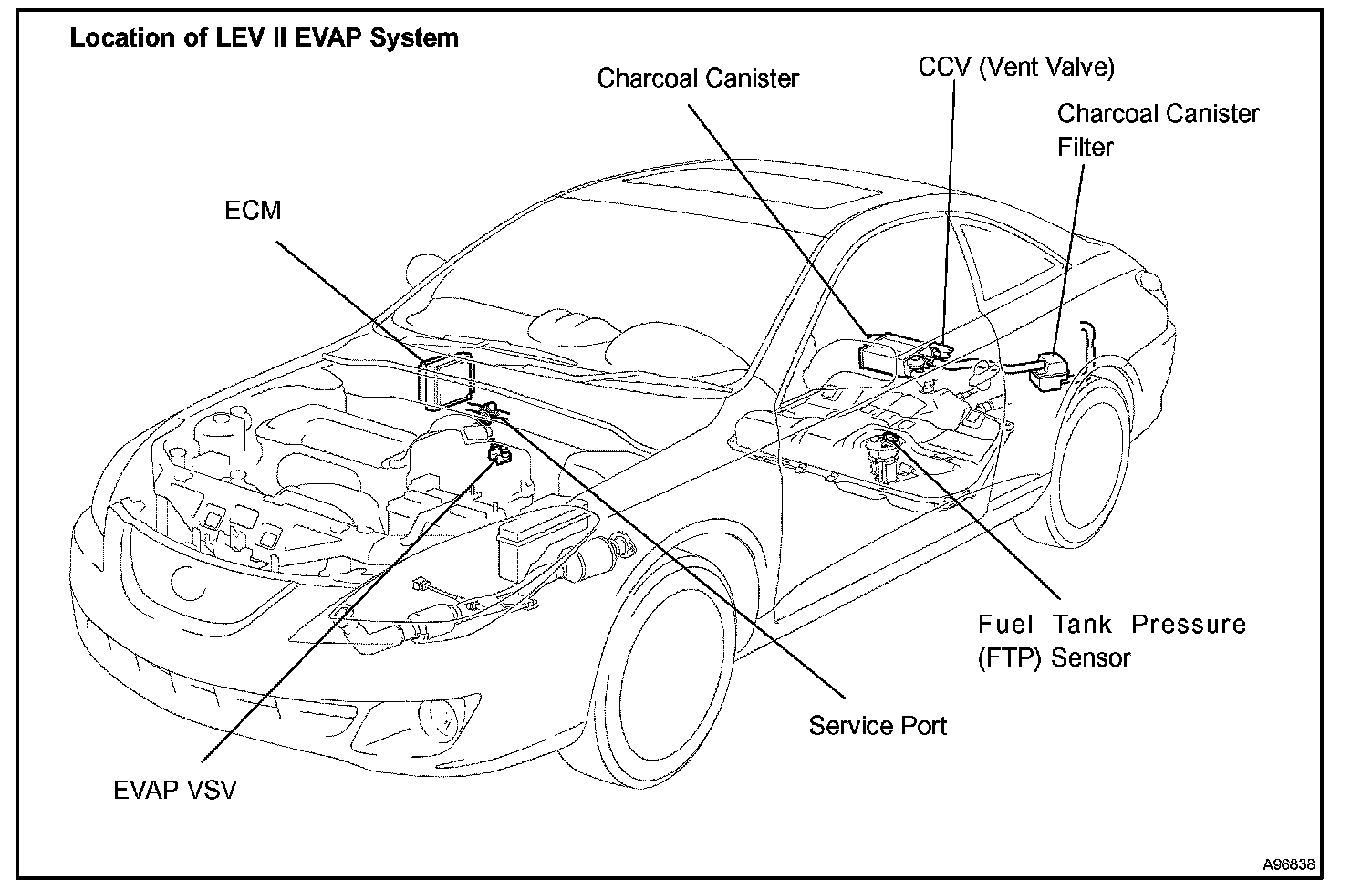 The EVAP system LEV II SYS CHECK is designed to confirm proper operation of the EVAP VSV and CCV, and determine if a leak or restriction is present in the system. During the check, the EVAP VSV and CCV are controlled in specific patterns to create negative pressure and/or restore ambient pressure to EVAP system. The hand-held tester displays the FTP sensor's value as these changes occur. By comparing the changes in the FTP sensor value to the expected results, suspect areas can be identified.