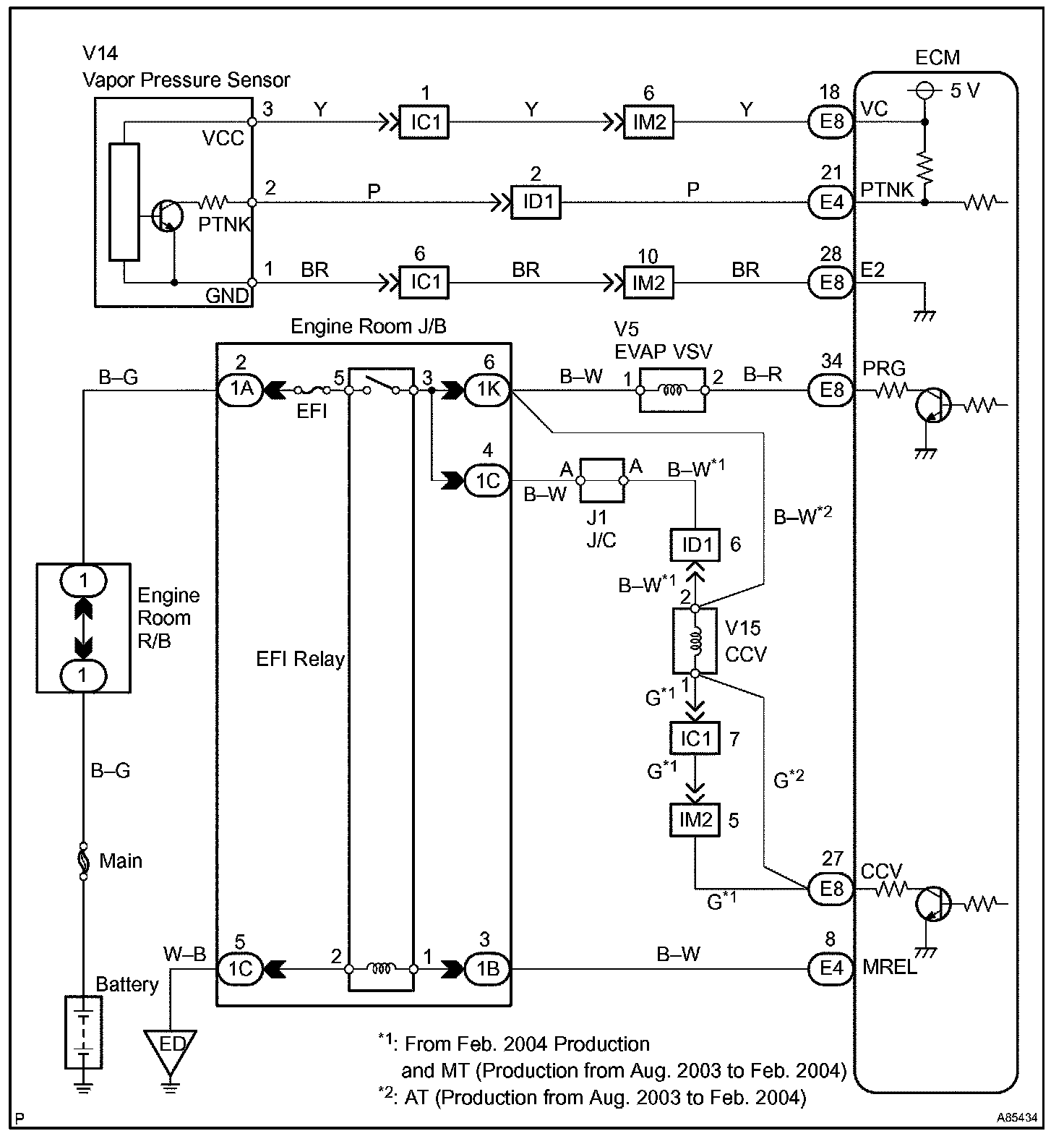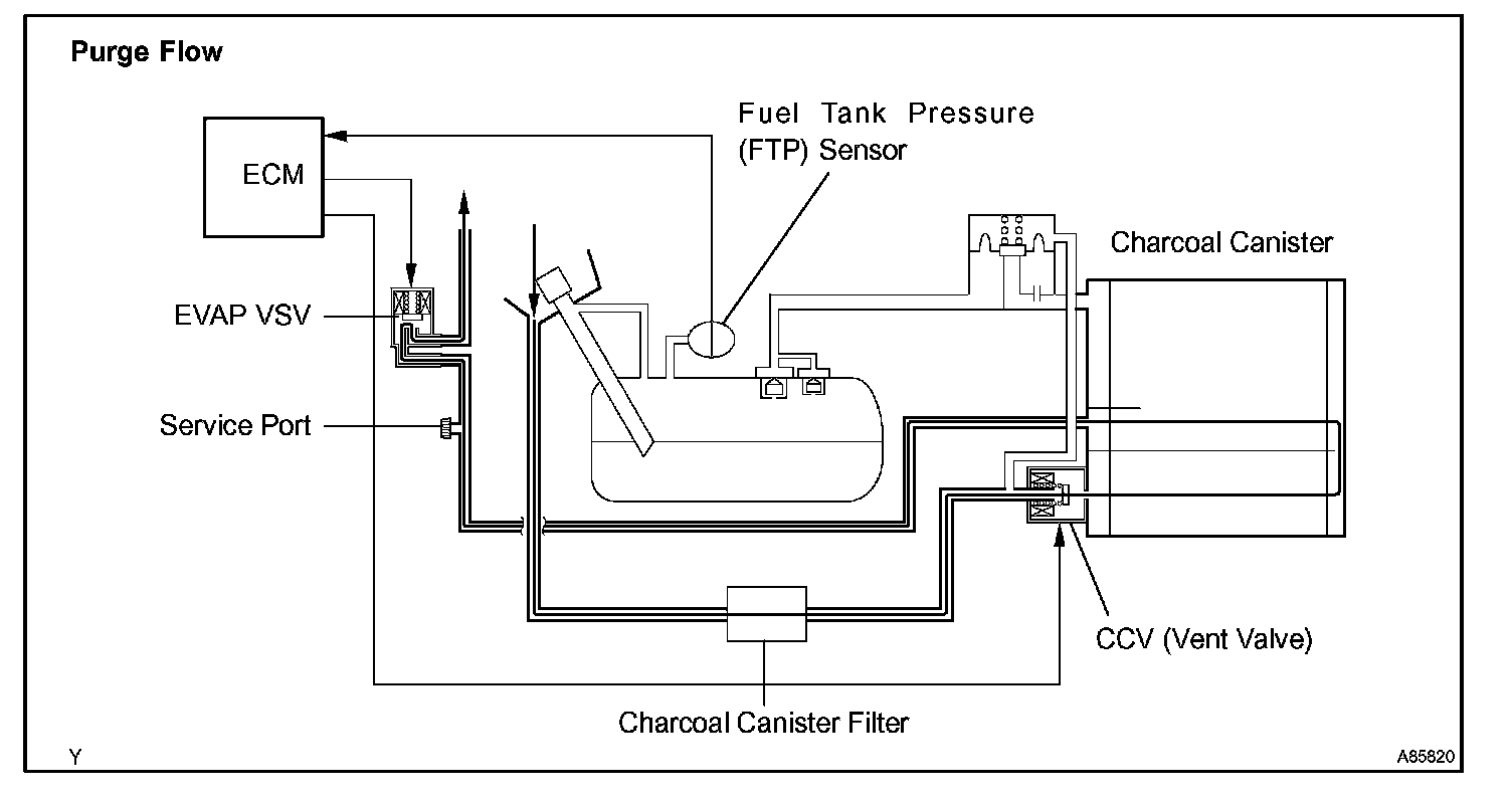 When predetermined conditions (closed loop, etc.) are met, the EVAP VSV is opened and stored fuel vapor in the canister is purged to the intake manifold. The ECM changes duty-cycle to the VSV to control purge flow volume. Purge flow volume is determined by the intake manifold pressure. Atmospheric pressure is allowed into the canister through the vent valve (CCV) to ensure that purge flow is maintained when negative pressure (vacuum) is applied to the canister.