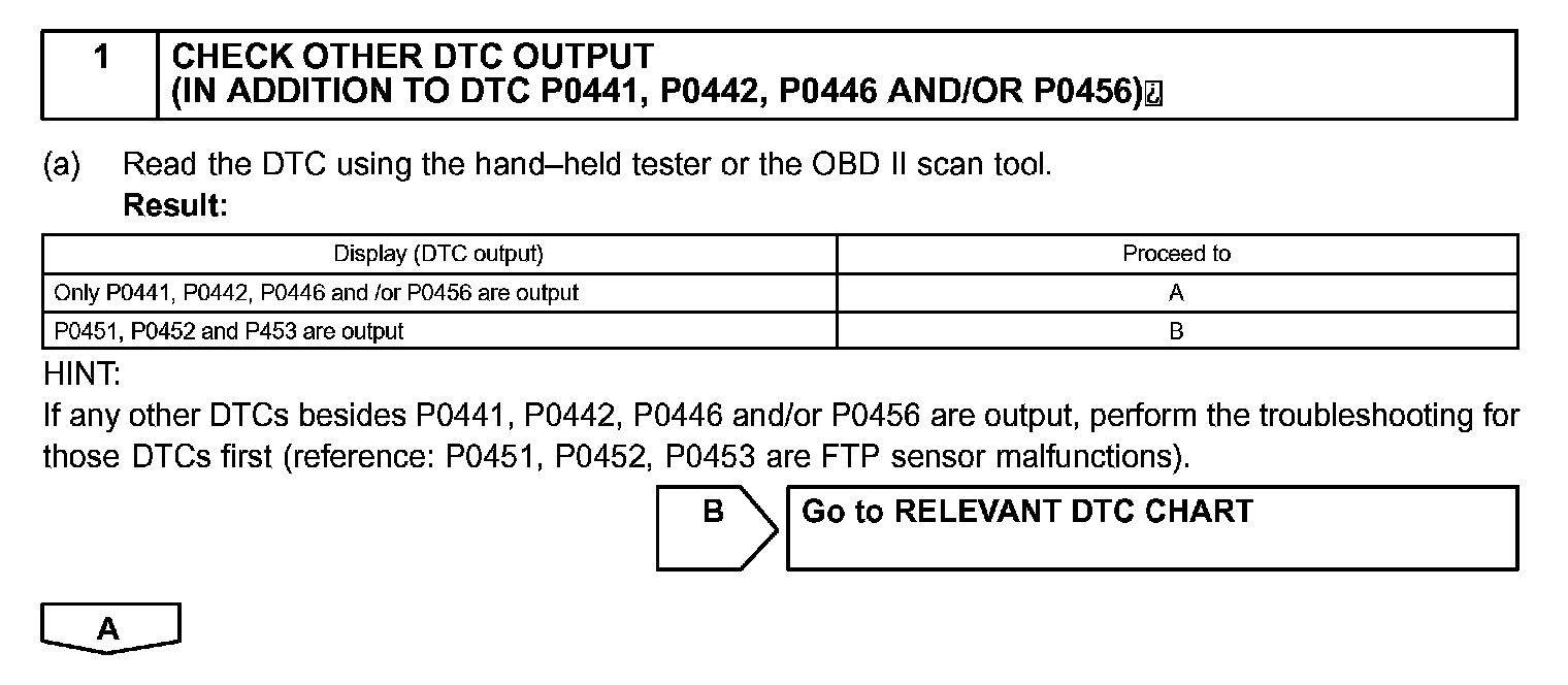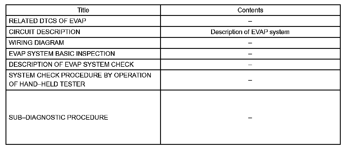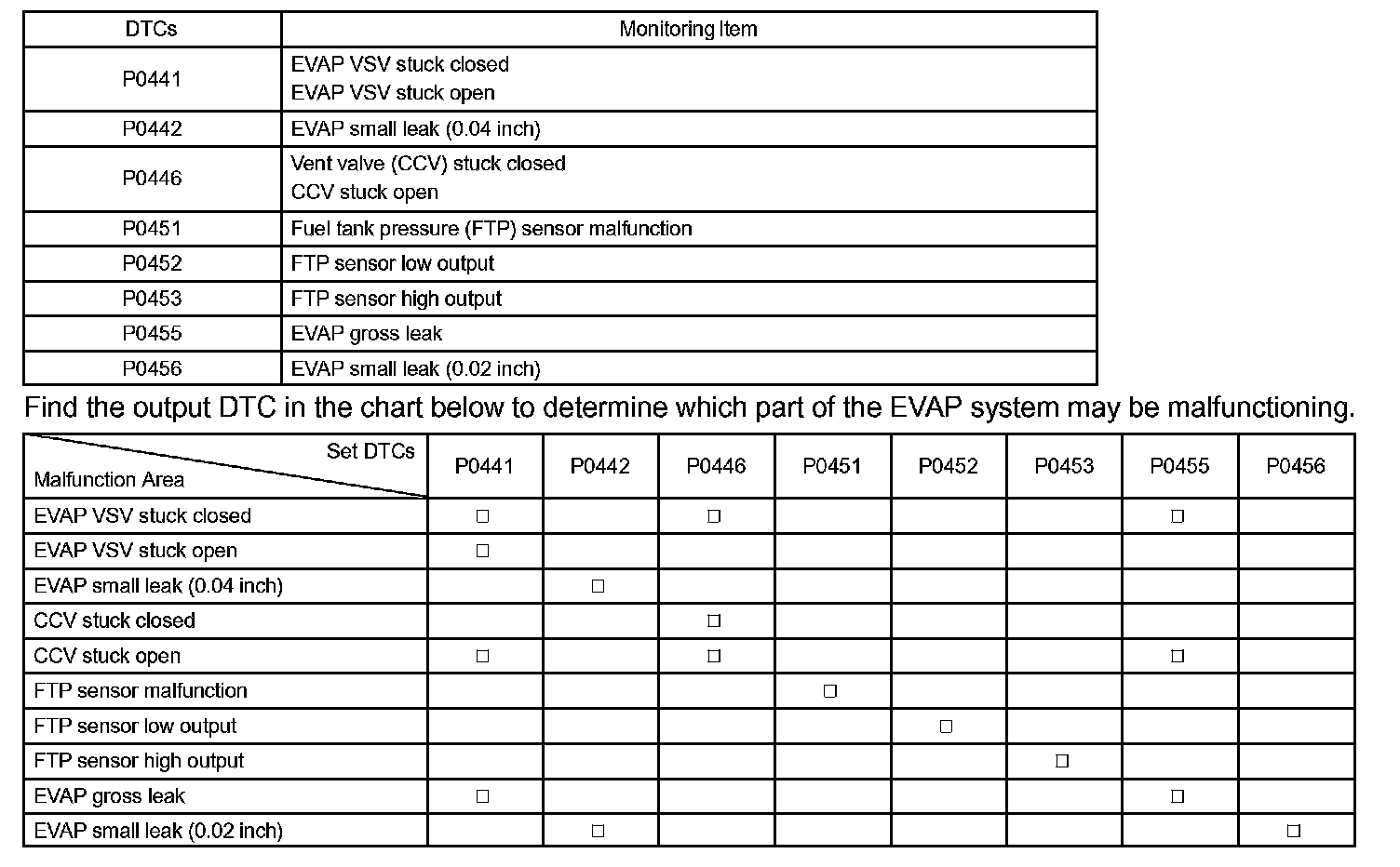 - Find the output DTC in the chart to determine which part of the EVAP system may be malfunctioning.