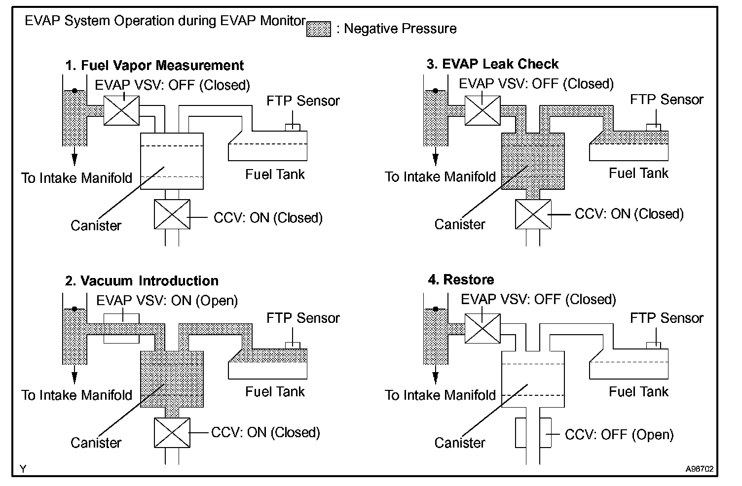 The EVAP monitor's purpose is to check for EVAP leaks and EVAP VSV and CCV malfunctions. The monitor performs the check by first introducing the intake manifold's negative pressure (vacuum) to the EVAP system. Then, the monitor records change in the EVAP system's pressure levels. The monitor runs when the following conditions are met: