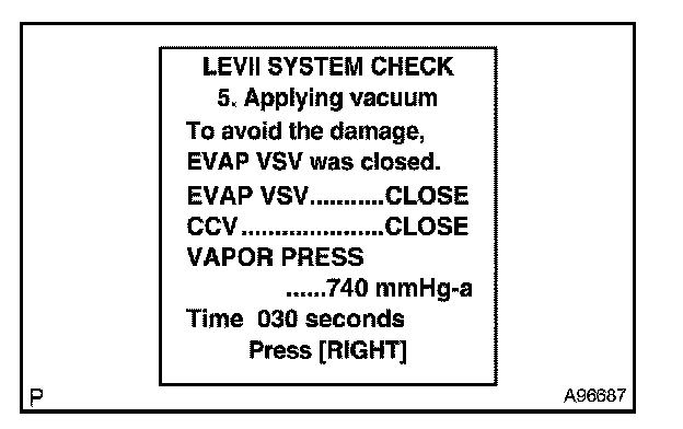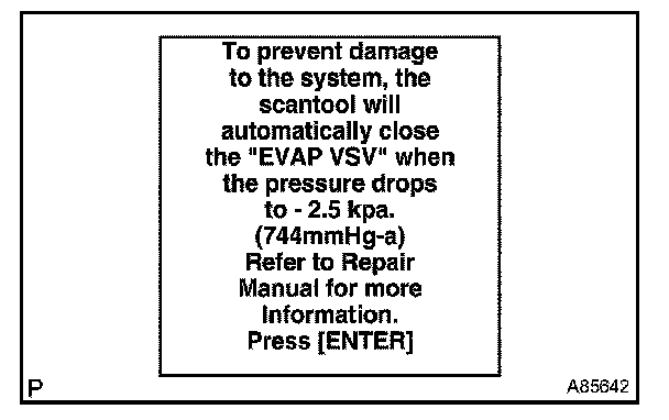 NOTE: If the pressure drops below 740 mmHg-a (-22 mmHg-g) at any point during this test, the hand-held tester will close the EVAP VSV to prevent system damage.