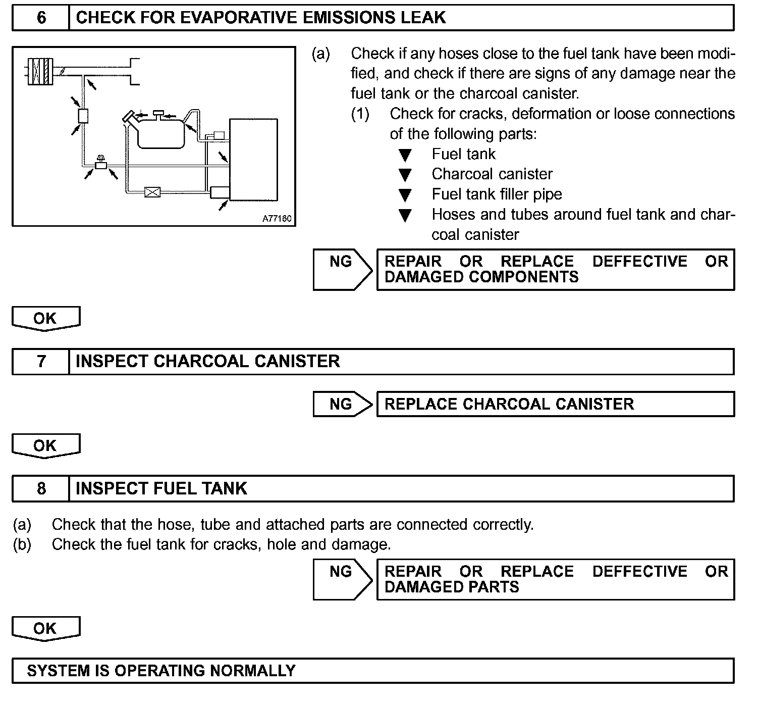 The system check can also be used to confirm that repairs have been made properly. After repairing the EVAP system, perform the LEV II SYS CHECK again to confirm that the system is operating normally.