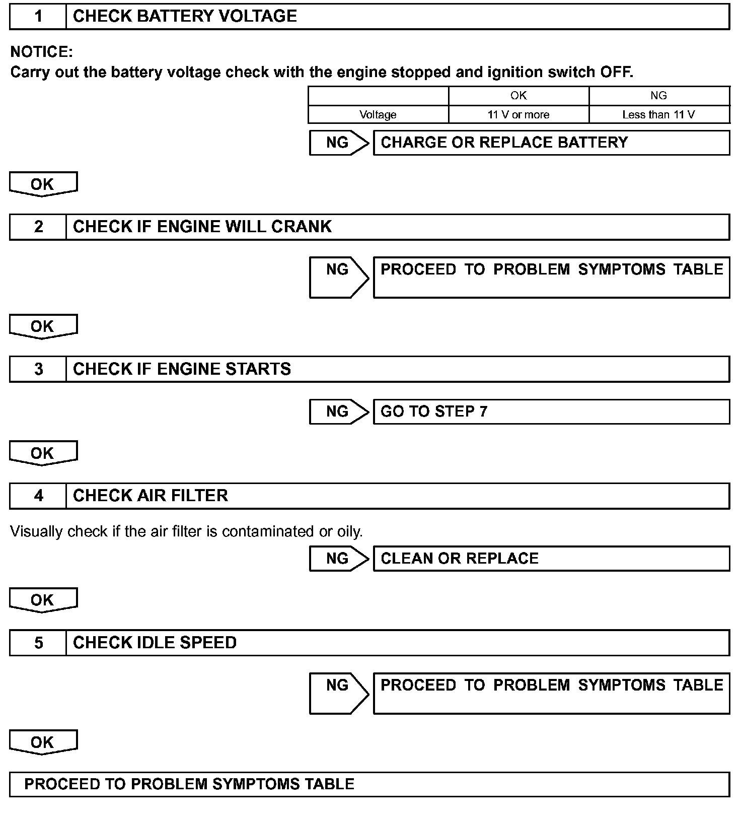 When the malfunction is not confirmed in the DTC check, troubleshooting should be carried out in all the possible circuits considered as possible causes of the problem. In many cases, by carrying out the basic engine check shown in the given flowchart, the problem can be found quickly and efficiently. Therefore, using this check is essential in the engine troubleshooting.