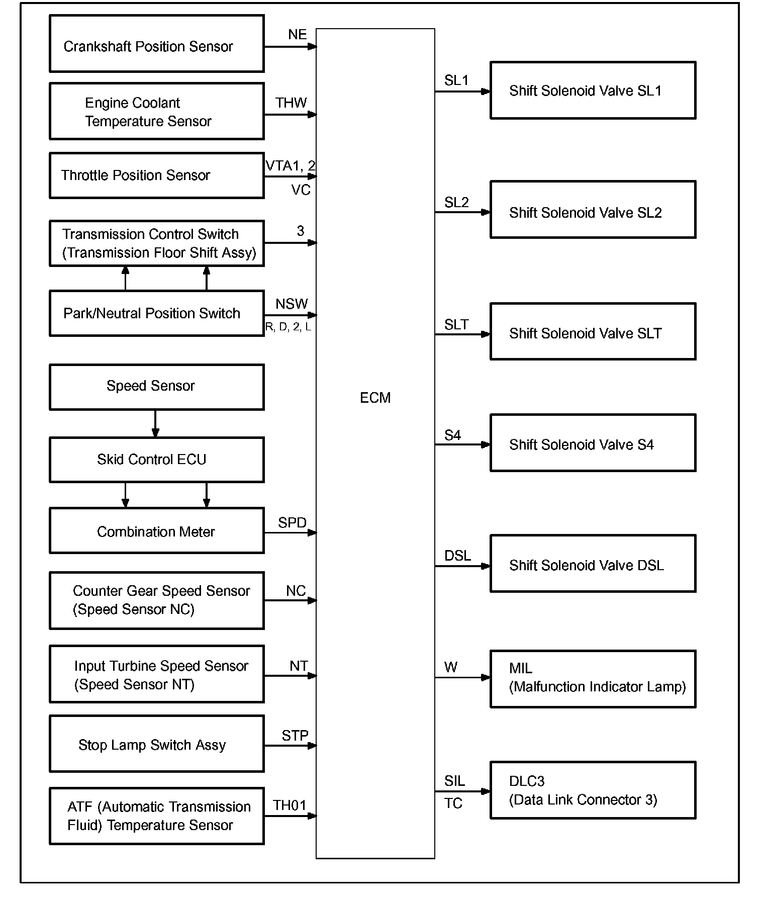 The configuration of the electronic control system in the U241E automatic transaxles is as shown in the chart.
