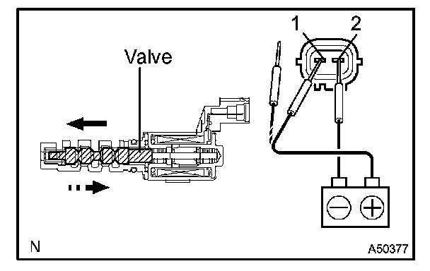 b. Connect the battery's positive (+) lead to terminal 1 and negative (-) lead to terminal 2, and check the movement of the valve.