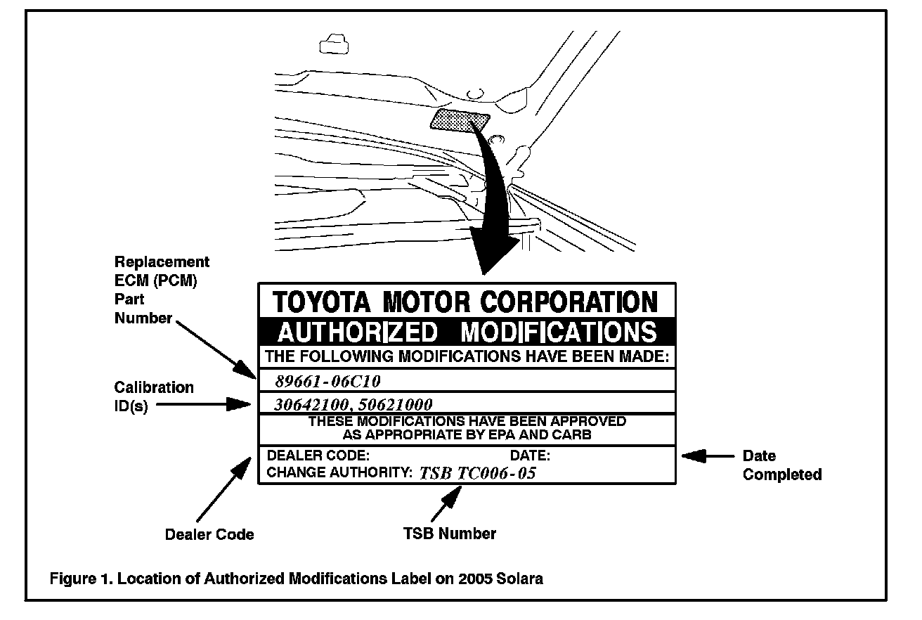 ^ Before proceeding, verify the ECM (PCM) calibration has NOT been updated by checking for the Authorized Modifications Label (shown in step 1 of the Repair Procedure).