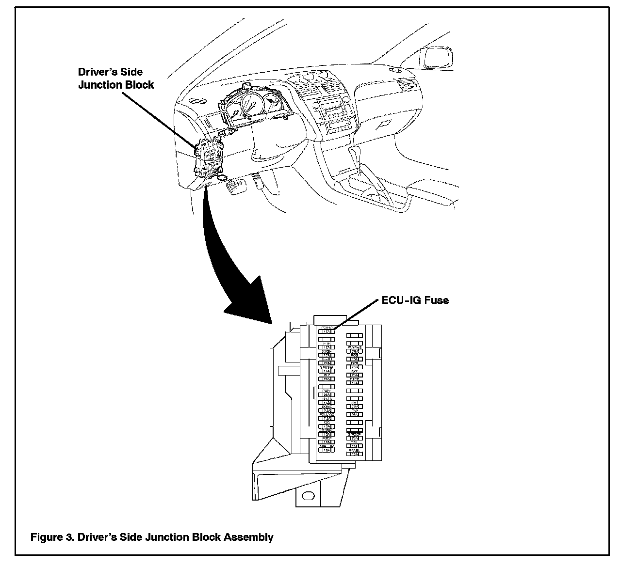 1. Remove the 10A ECU-IG fuse from the driver's side Junction Block assembly. This action prevents possible activation of the ABS relay, resulting in ECM Reprogramming failure.