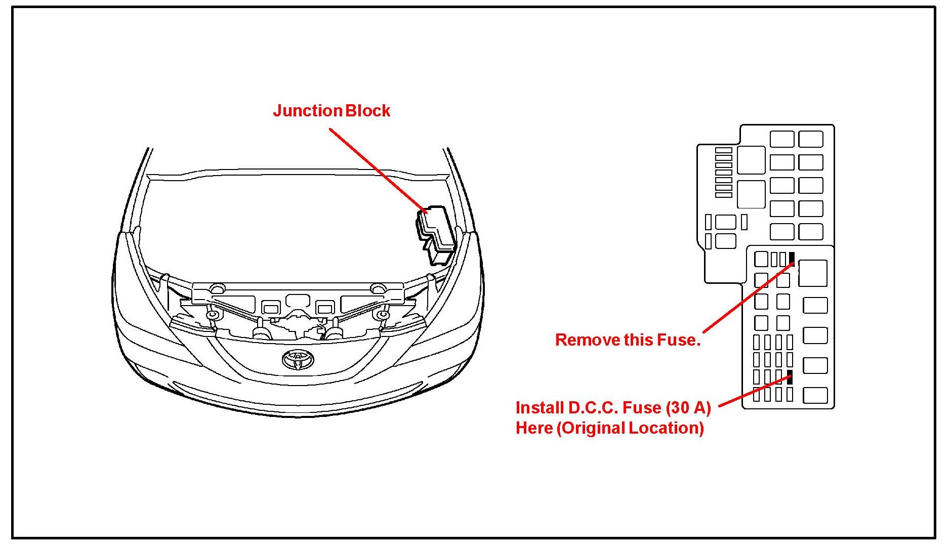 The removed D.C.C. fuse (30 A) is stored in the blank space of the junction block in the engine compartment. The D.C.C. fuse must be reinstalled to the original location during Pre-Delivery Service (PDS) in the dealership as shown.