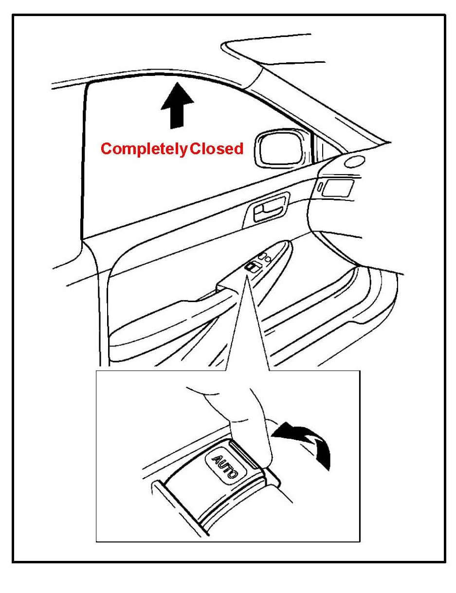 3. Pull and hold up the driver's door power window switch until the window closes. Continue holding the switch for approximately one second until the switch changes from blinking to a constant illumination.