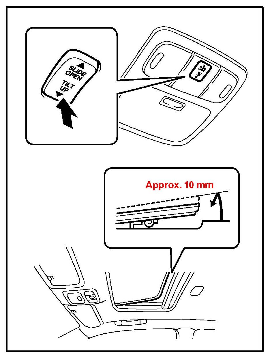 2. Push and hold the moon roof switch to the "TILT- UP" side until the moon roof tilts all the way up and then tilts down slightly (approximately 10 mm at rear end).