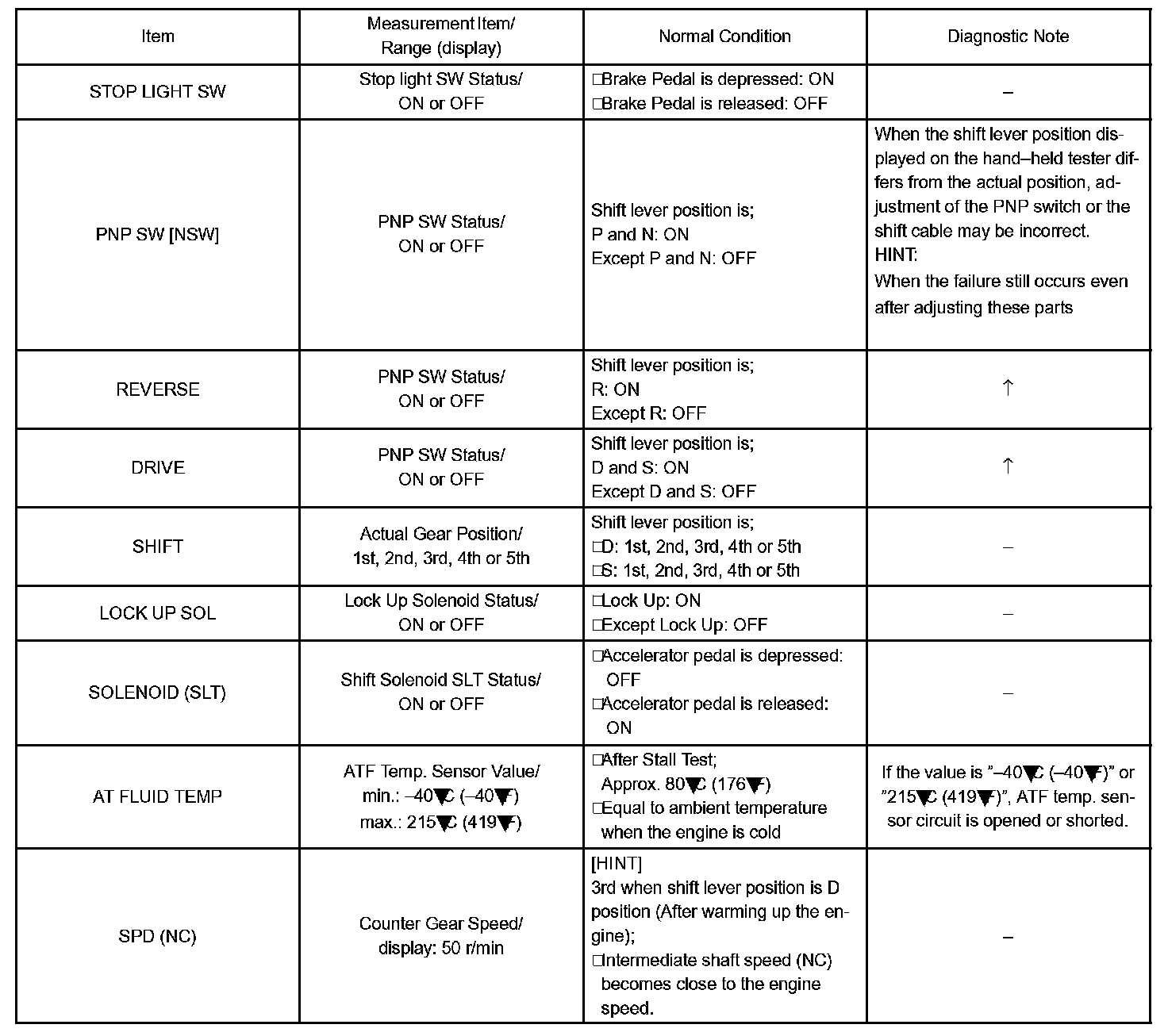 HINT: According to the DATA LIST displayed by the OBD II scan tool or hand-held tester, you can read the value of the switch, sensor, actuator and so on without parts removal. Reading the DATA LIST as the first step of troubleshooting is one method to shorten labor time.