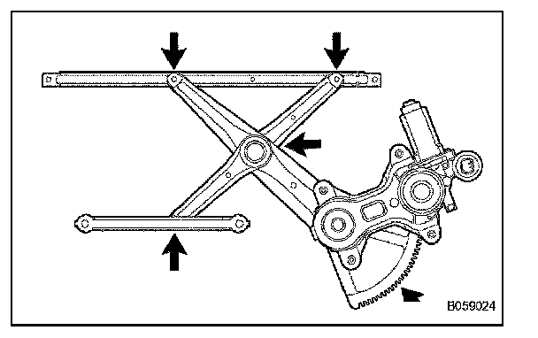 a. Apply MP grease to the sliding and rotating parts of the window regulator.