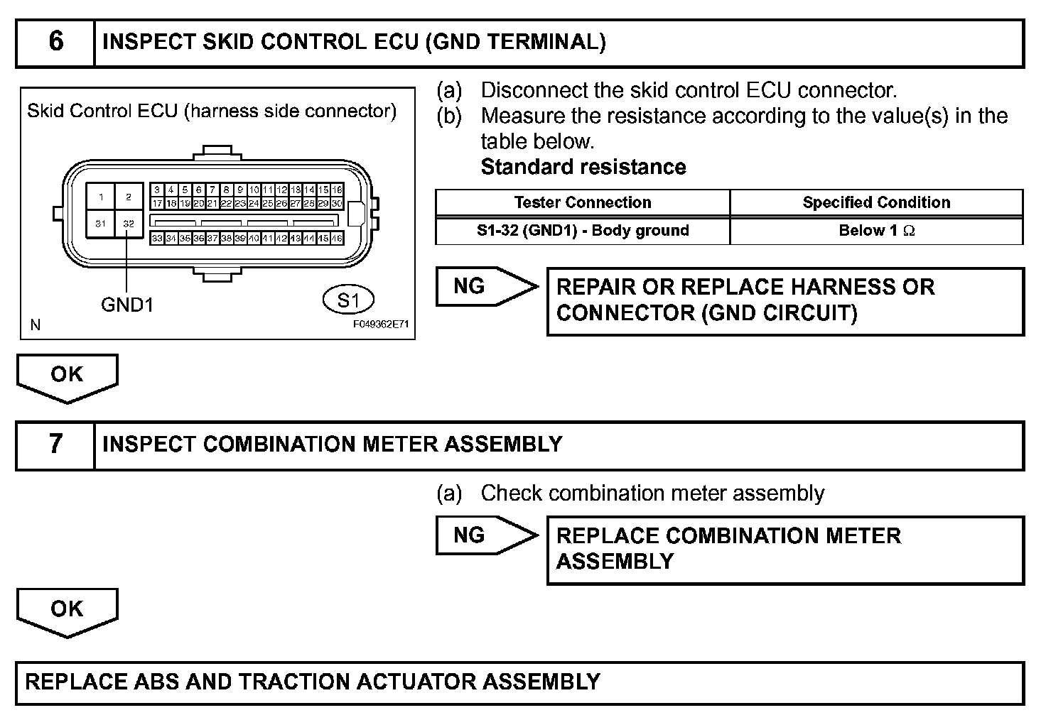 c. There is an open in the wire harness between the combination meter and skid control ECU.