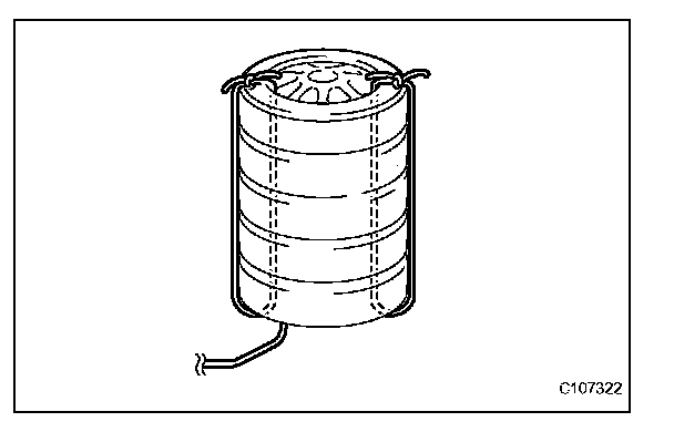 4. Face the airbag deployment side of the steering pad upward on top of a tire and wheel set. Separately tie the left and right sides of the steering pad to the disc wheel through the hub nut holes. Position the SST connector so that it hangs downward through the hub hole of the disc wheel.