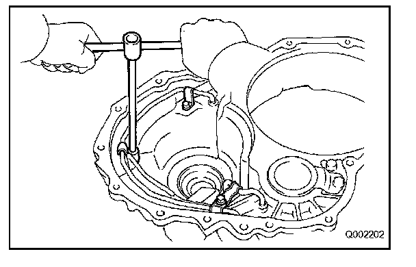 (a) Setting SST to the cut-out portion on the differential case, remove the front drive pinion rear tapered roller bearing from the differential case.