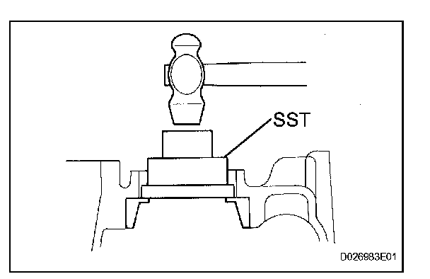 (c) Using SST and a hammer, drive out the front drive pinion front tapered roller bearing outer race.