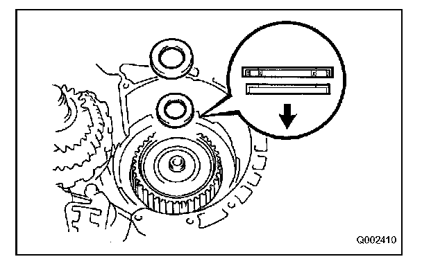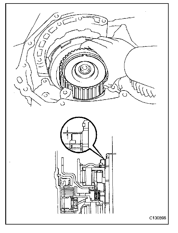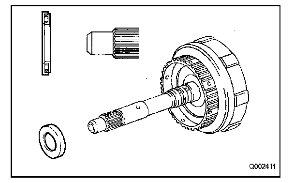 (c) Hold the input shaft, and lightly press the oil pump body to slide the oil seal rings on the input shaft through the direct clutch drum.