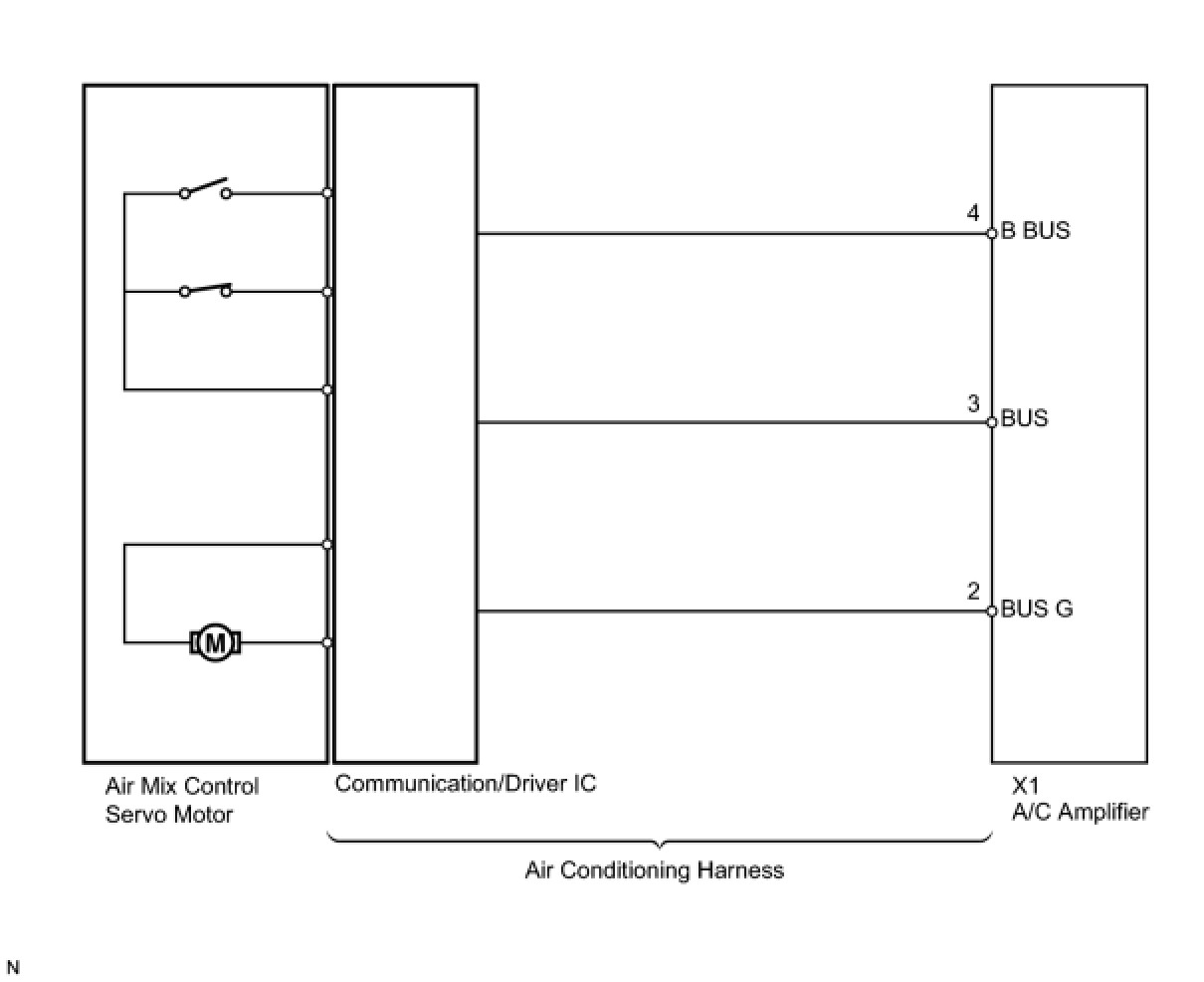 The air mix damper servo sends pulse signals to inform the air conditioning amplifier of the damper position. The air conditioning amplifier activates the motor (normal, reverse) based on the signals to move the air mix damper (passenger seat) to any position, which adjusts the amount of air passing the heater core after passing the evaporator to control the blowing temperature. The A/C amplifier communicates with the servo through a communication/driver IC and wiring assembly called the air conditioning harness.