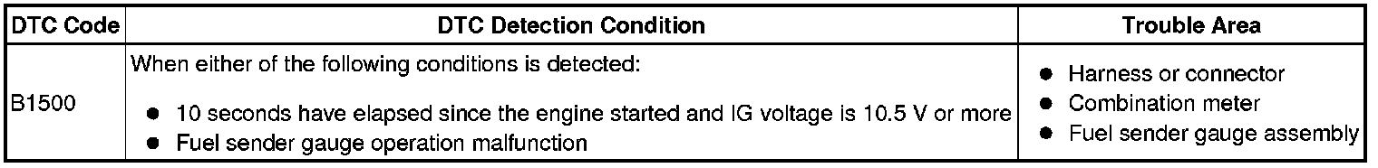 This DTC is output when the combination meter detects the fuel sender gauge malfunction via the direct line.