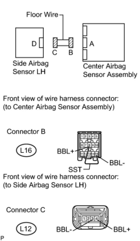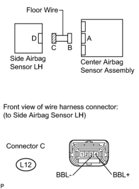 The side airbag sensor LH circuit consists of the center airbag sensor assembly, side airbag sensor LH and rear airbag sensor LH.