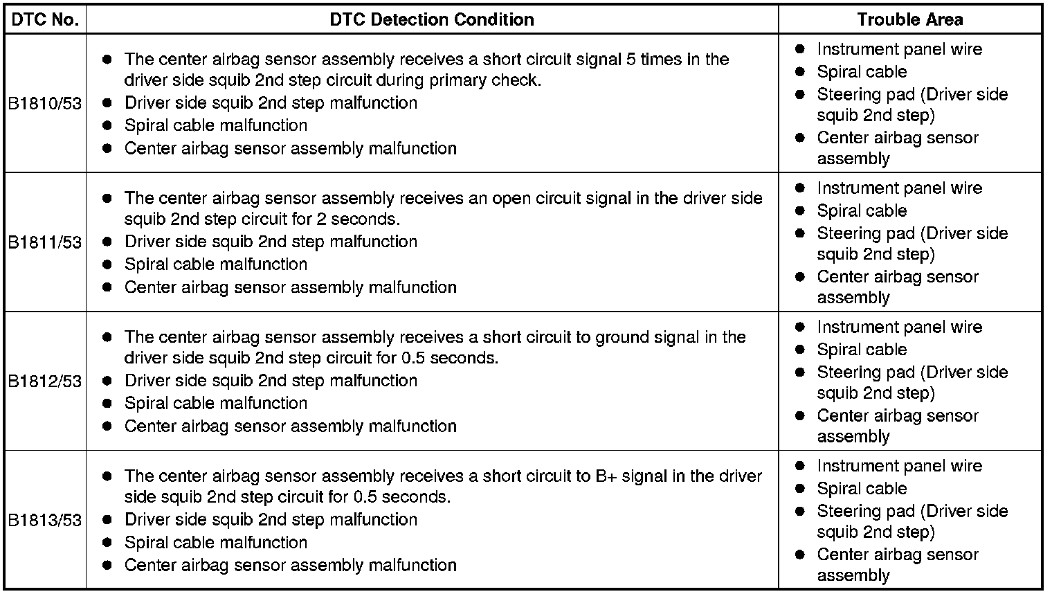 - These DTCs are recorded when a malfunction is detected in the driver side squib 2nd step circuit.