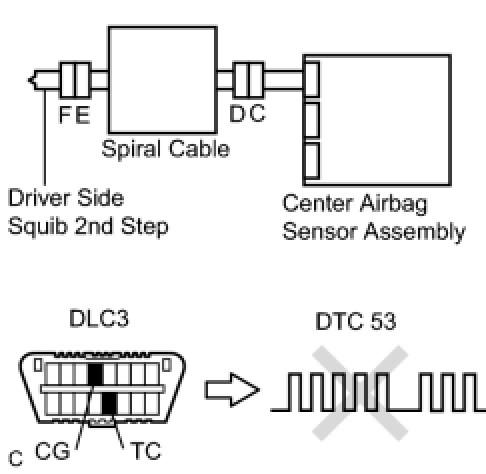 - The driver side squib 2nd step circuit consists of the center airbag sensor assembly, the spiral cable and the steering pad.