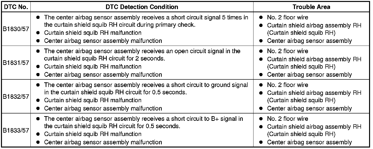 These DTCs are recorded when a malfunction is detected in the curtain shield squib RH circuit.