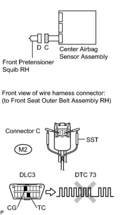 The front pretensioner squib RH circuit consists of the center airbag sensor assembly and the front seat outer belt assembly RH.