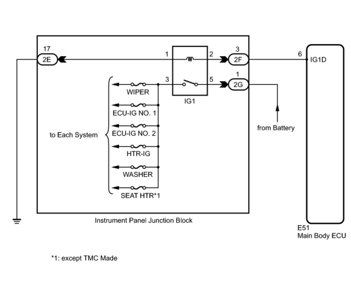 This DTC is output when there is a problem in the IG1D output circuit, which is from the inside of the main body ECU (instrument panel junction block) to the IG1 relay.