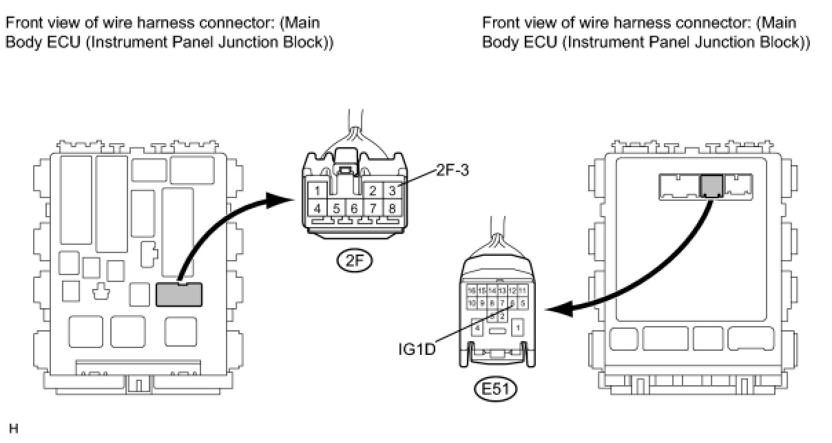 HINT: When the main body ECU (instrument panel junction block) is replaced with a new one and the cable from the negative (-) battery terminal is connected, the power source mode becomes the IG-ON mode. When the battery is removed and reinstalled, the power source mode that was selected when the battery was removed is restored.