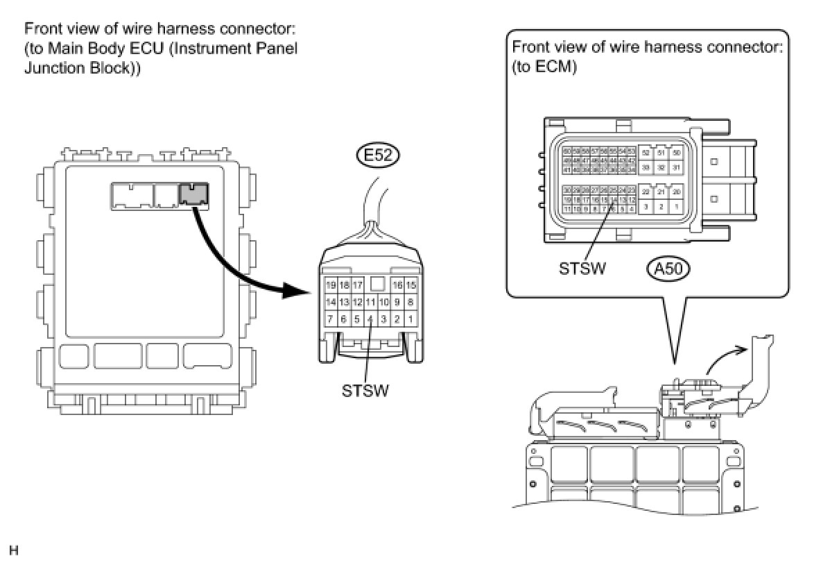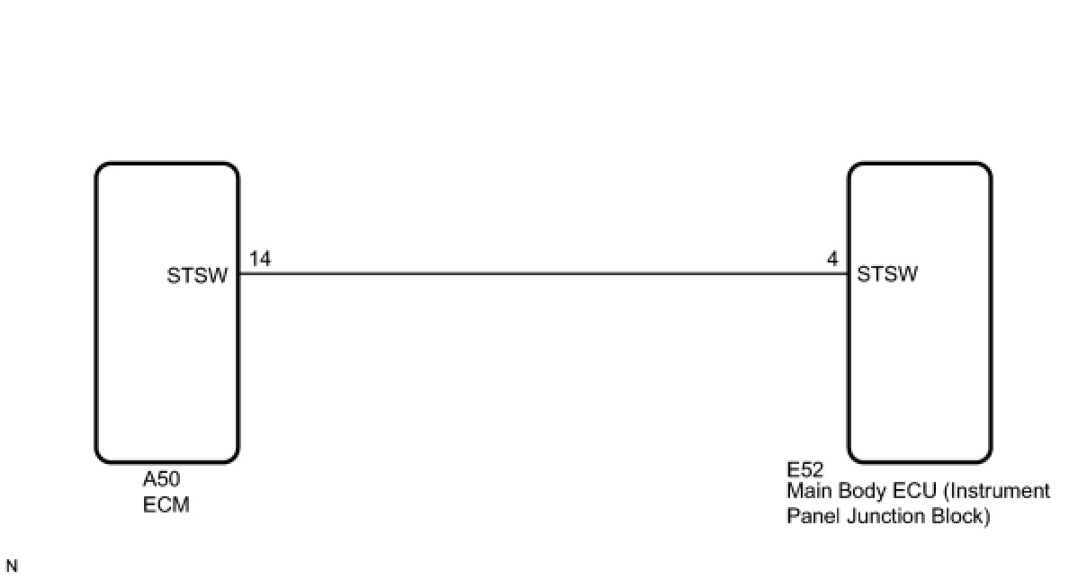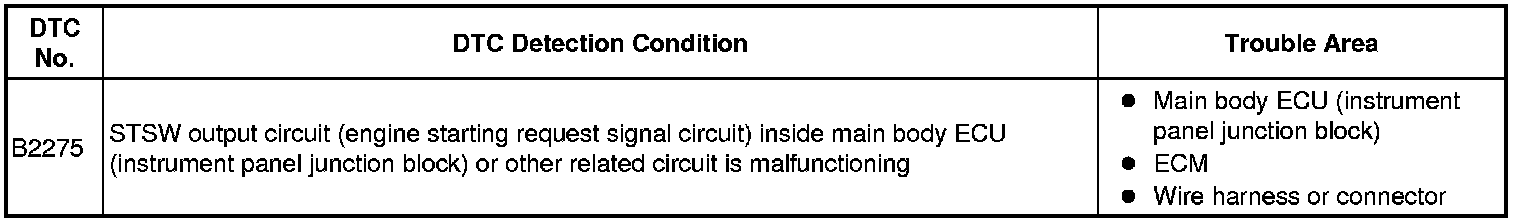 This DTC is output when there is an open, short, or any other problem in the engine start request output circuit inside the main body ECU (instrument panel junction block) or in the external circuit.
