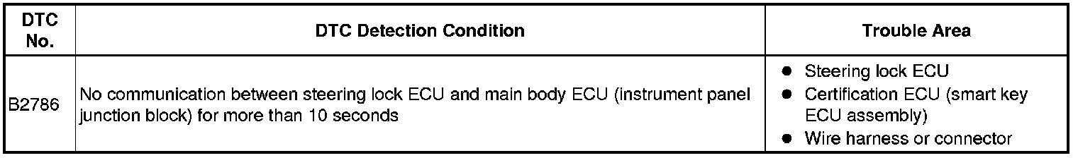 This DTC is output when LIN communication between the certification ECU (smart key ECU assembly) and the steering lock ECU (steering lock actuator assembly) stops for more than 10 seconds.
