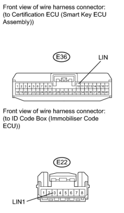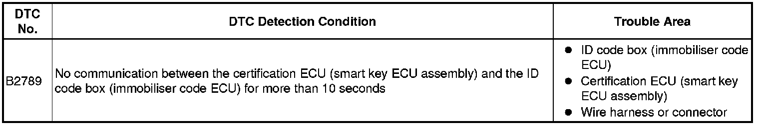 This DTC is output when LIN communication between the certification ECU (smart key ECU assembly) and the ID code box (immobiliser code ECU) stops for more than 10 seconds.