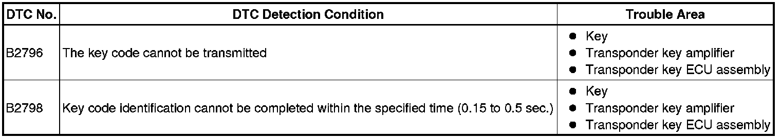 These DTCs are output if a key that does not have a transponder chip is inserted into the ignition key cylinder or if communication between the key and the transponder key ECU assembly is impossible.