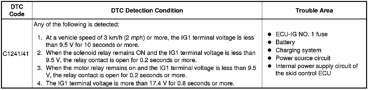 If a malfunction is detected in the power supply circuit, the skid control ECU (housed in the actuator assembly) stores this DTC and the fail safe function prohibits ABS operation.