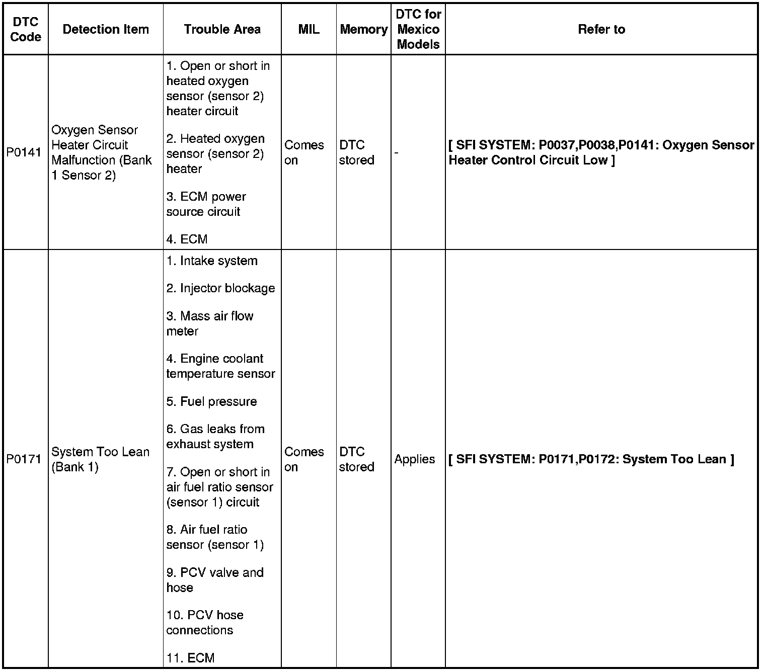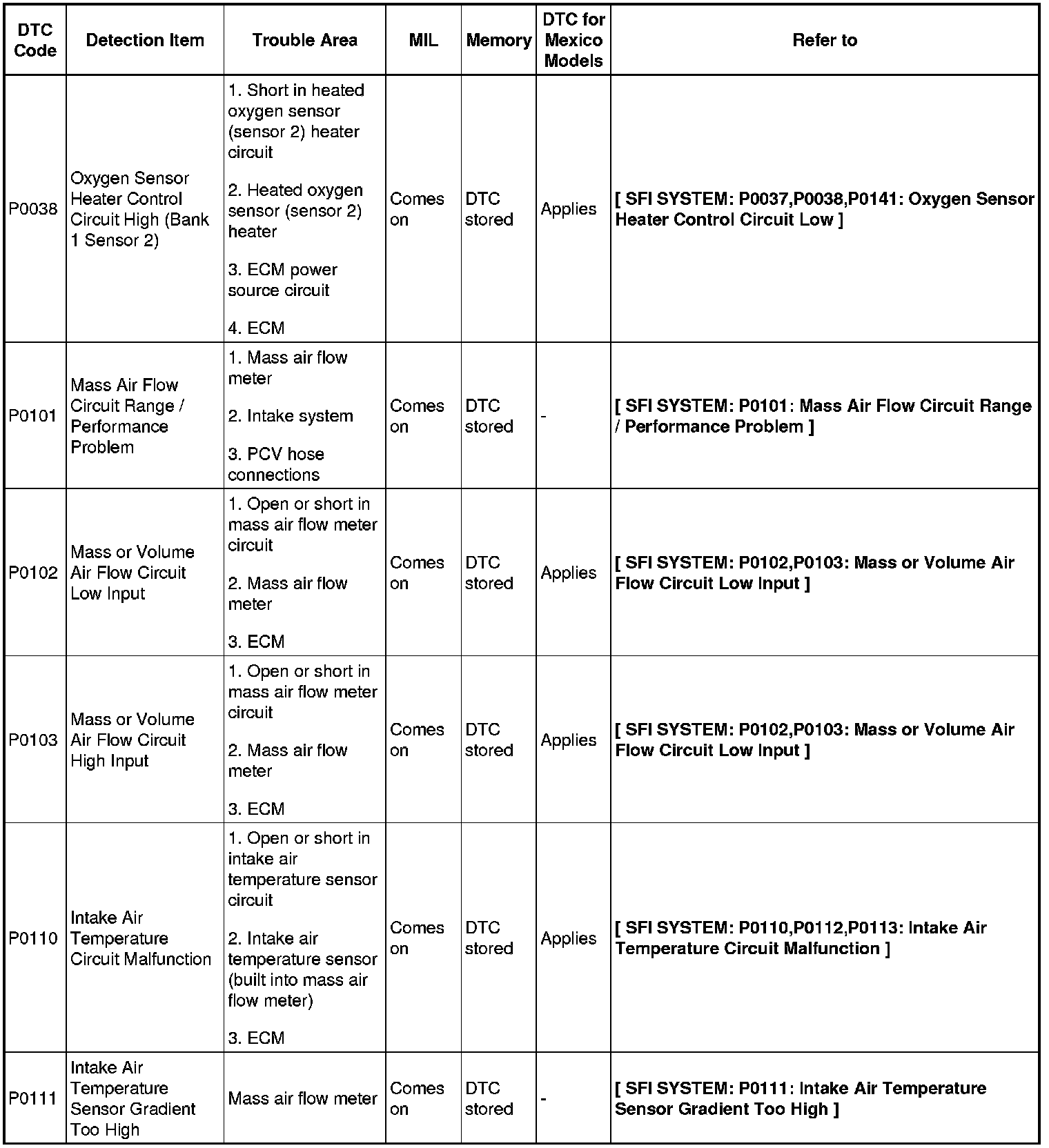 HINT: Parameters listed in the chart may not be exactly the same as your readings due to the type of instrument or other factors. If a trouble code is displayed during the DTC check, inspect the trouble areas listed for that code. For details of the code, refer to the "Refer to" below.