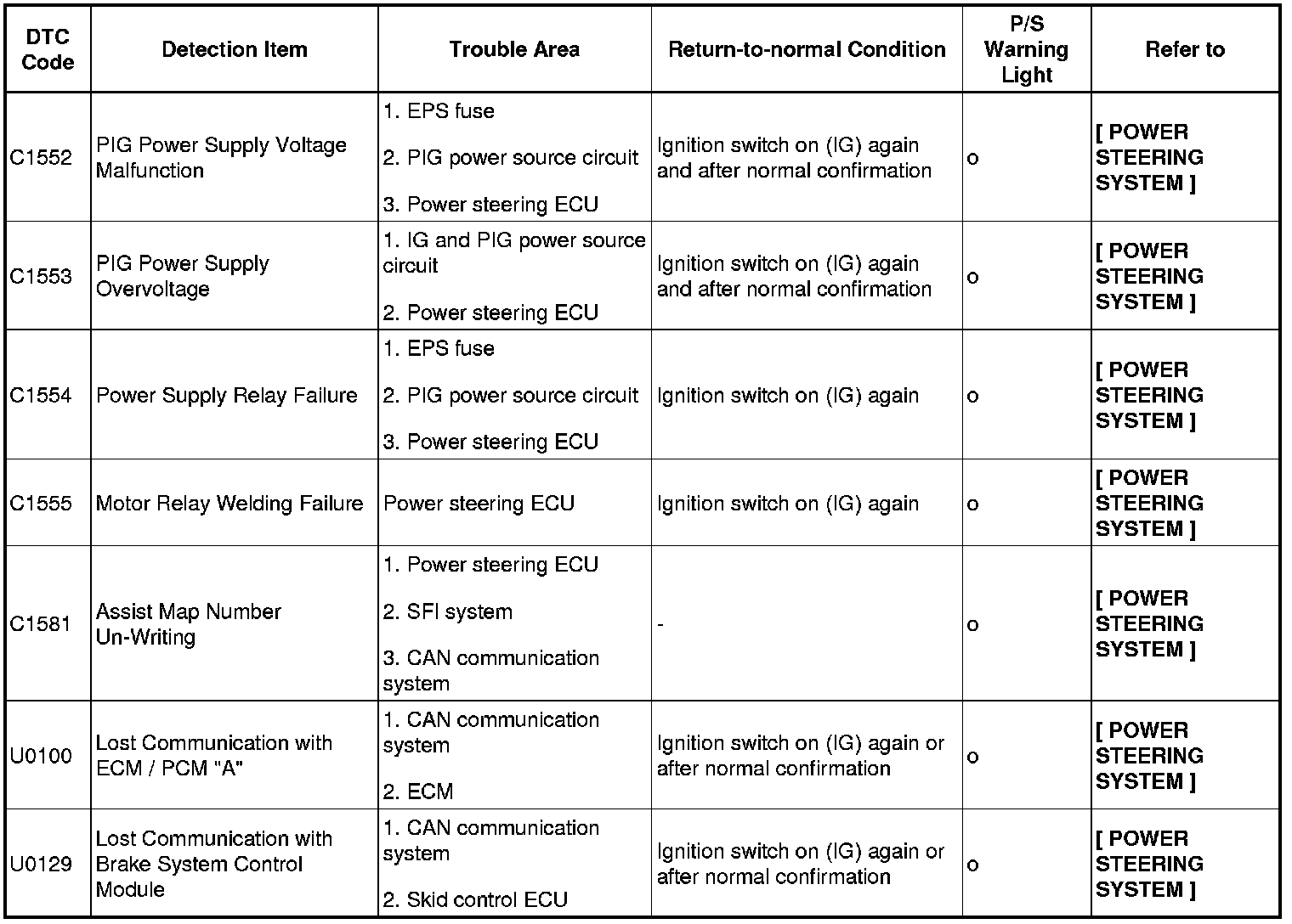 POWER ASSIST SYSTEMS: POWER STEERING SYSTEM (for 2ZR-FE): DIAGNOSTIC TROUBLE CODE CHART