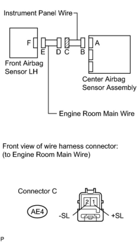 (c) Check that the connectors are properly connected to the center airbag sensor assembly and the front airbag sensor LH. Also check that the connectors that link the engine room main wire and instrument panel wire are properly connected.