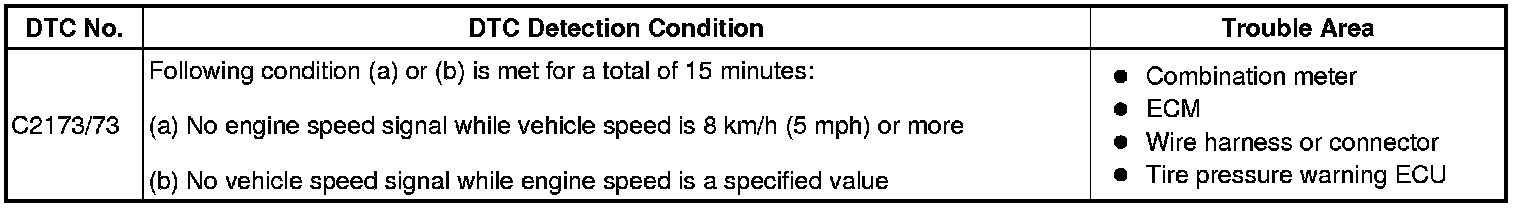TIRE PRESSURE MONITORING: TIRE PRESSURE WARNING SYSTEM: C2173/73: Vehicle Speed or Engine Speed Signal Malfunction