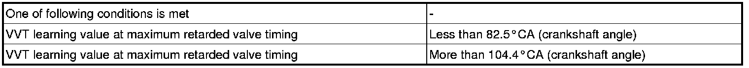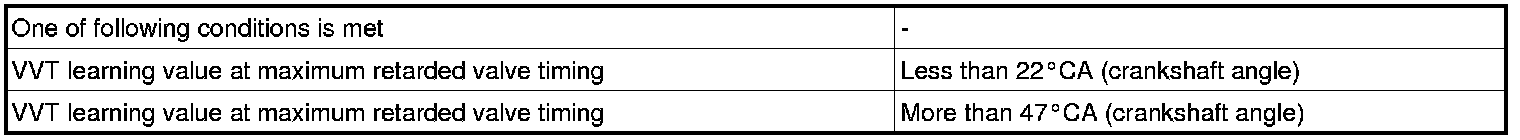 To monitor the correlation of the intake camshaft position and crankshaft position, the ECM checks the VVT learning value while the engine is idling. The VVT learning value is calibrated based on the camshaft position and crankshaft position. The intake valve timing is set to the most retarded angle while the engine is idling. If the VVT learning value is out of specified range in consecutive driving cycles, the ECM illuminates the MIL and sets the DTC P0016.