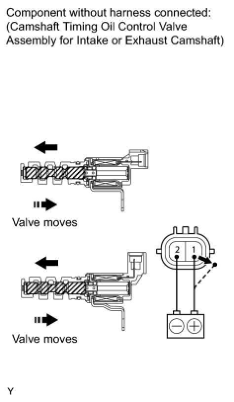 (c) Apply battery voltage to terminals of the camshaft timing oil control valve assembly (for intake or exhaust camshaft). Check the valve operation.