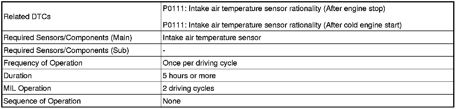 The monitor runs when the engine is started cold after 5 hours or more have elapsed since the engine stopped. If the intake air temperature sensor output variation until the engine has warmed up completely is less than the threshold, it is determined that a malfunction has occurred in the intake air temperature sensor. When this is detected in 2 consecutive driving cycles, the MIL is illuminated and the DTC is set.